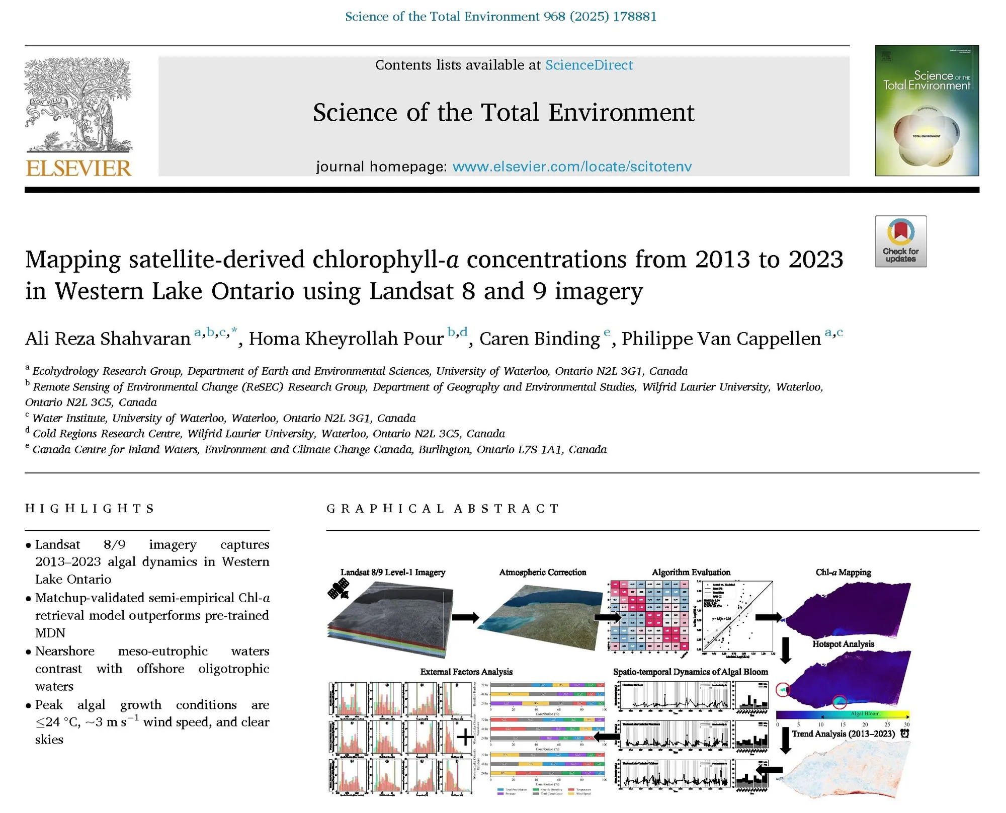 A new paper published in Science of The Total Environment, titled “Mapping satellite-derived chlorophyll-a concentrations from 2013 to 2023 in Western Lake Ontario using Landsat Series