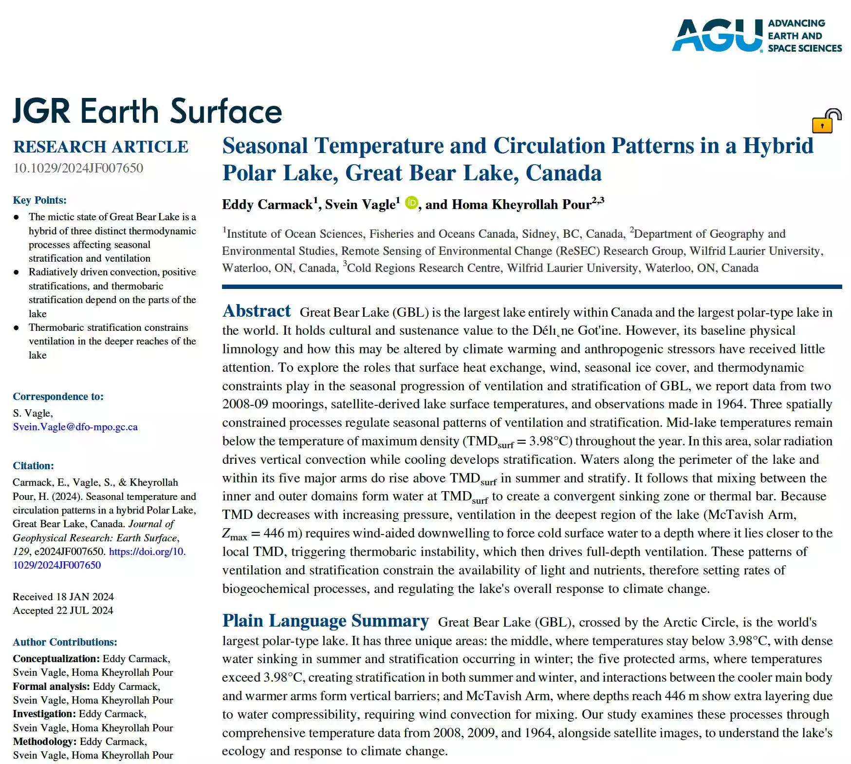 Seasonal Temperature and Circulation Patterns in a Hybrid Polar Lake, Great Bear Lake, Canada paper is published in the Journal of Geophysical Research: Earth Surface