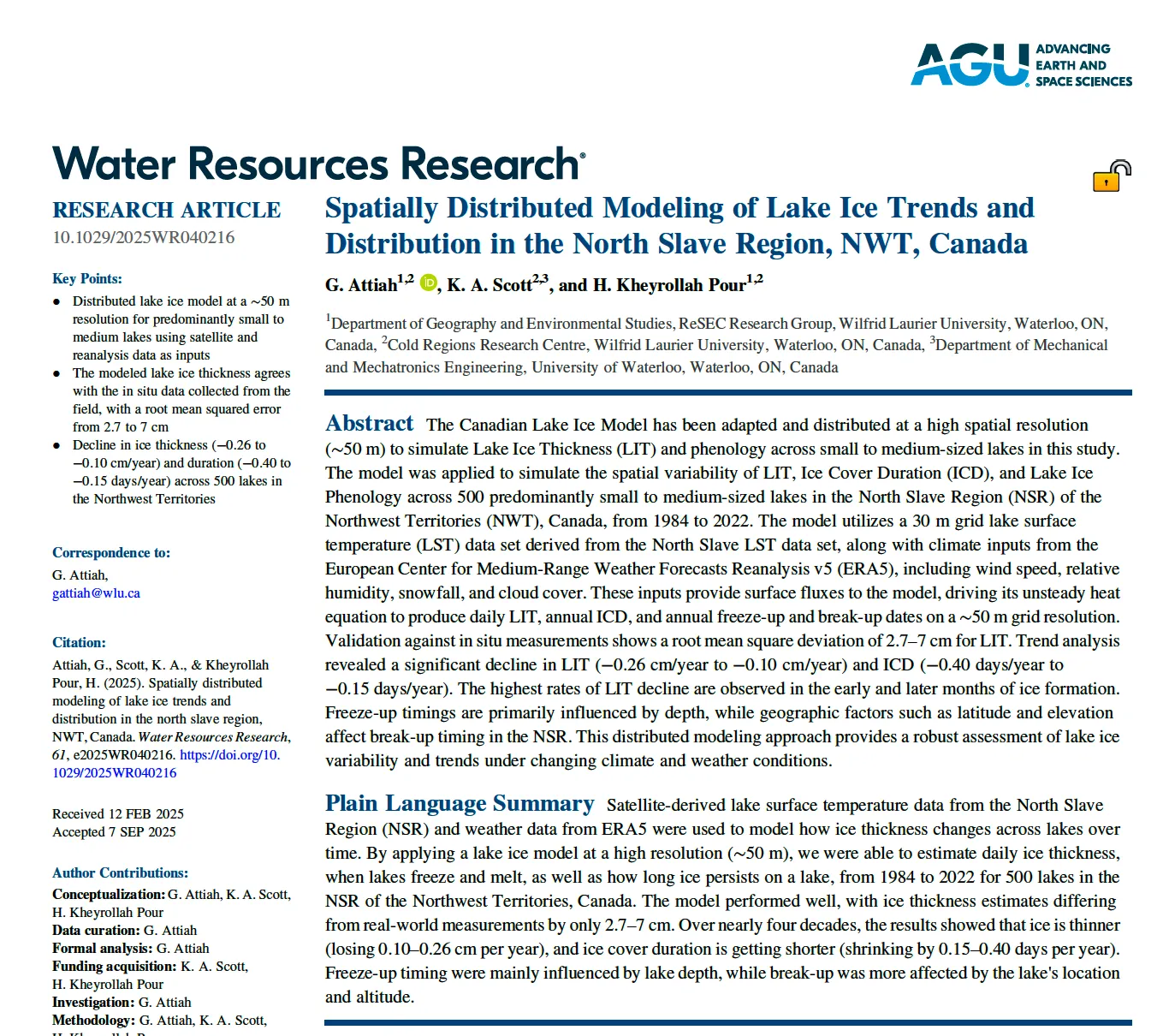 ReSEC Team member, Dr. Attiah, used an advanced spatially distributed model, CLIMoGrid, to simulate ice thickness and phenology across 500 lakes from 1984 to 2022. Key findings show that lake ice thickness (LIT) has declined, while the duration of ice cover (ICD) has shortened annually. These trends were especially pronounced during early freeze-up and late break-up periods. Deeper lakes tended to freeze later and exhibit more rapid thinning, while northern and higher-elevation lakes maintained ice longer.